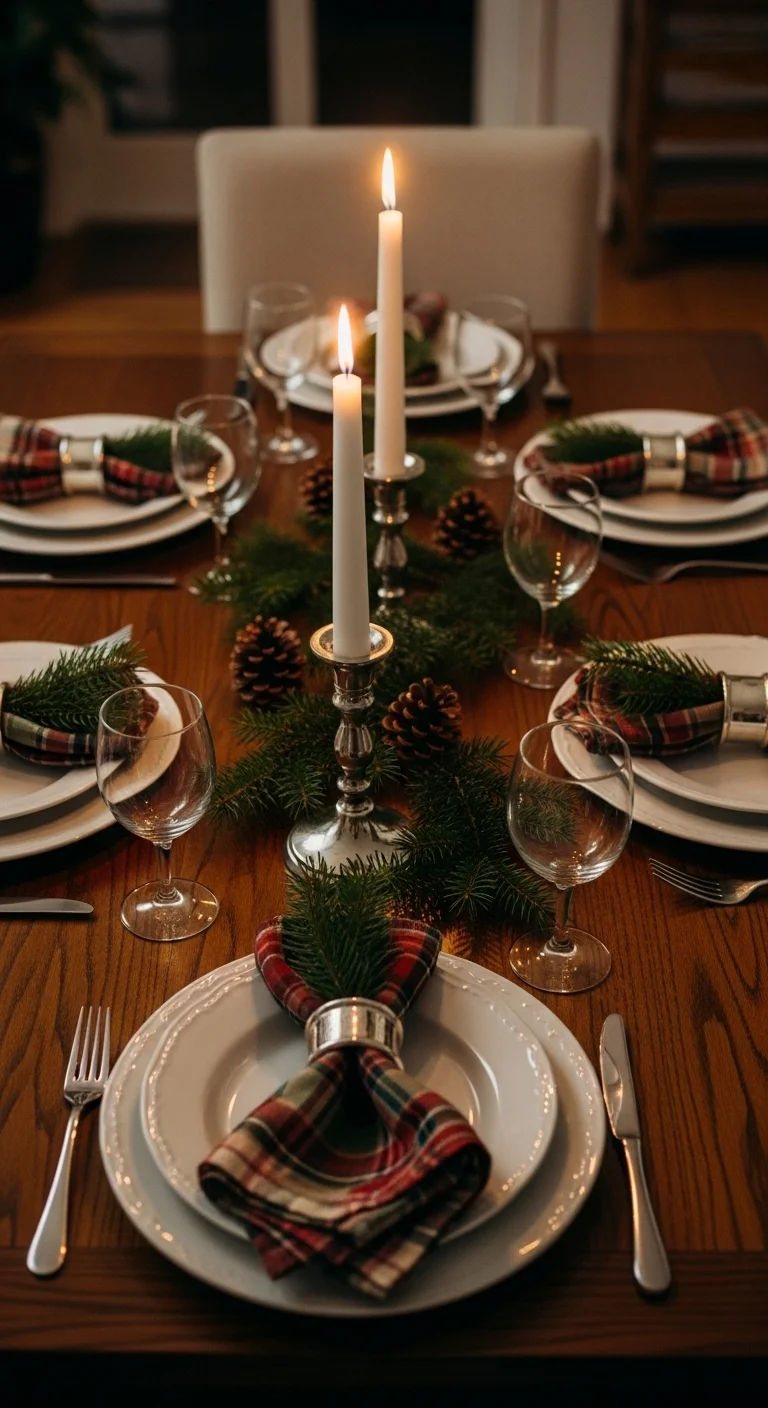 Set a festive table with natural elements and warm lighting. Layer neutral linens with greenery down the center. Add pine sprigs to napkins for a personal touch. Use mismatched dishes for charm. A few candles complete the look without overspending.