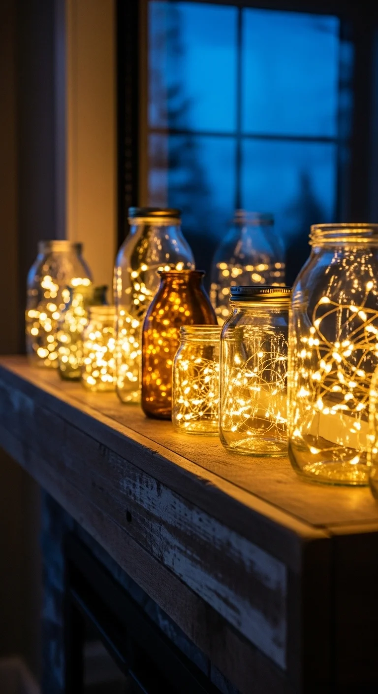 Fill mason jars or old vases with fairy lights. Place them around the house for a gentle glow. You can mix in ornaments or pine sprigs inside. It’s affordable, reusable, and gives off cozy warmth perfect for quiet evenings.