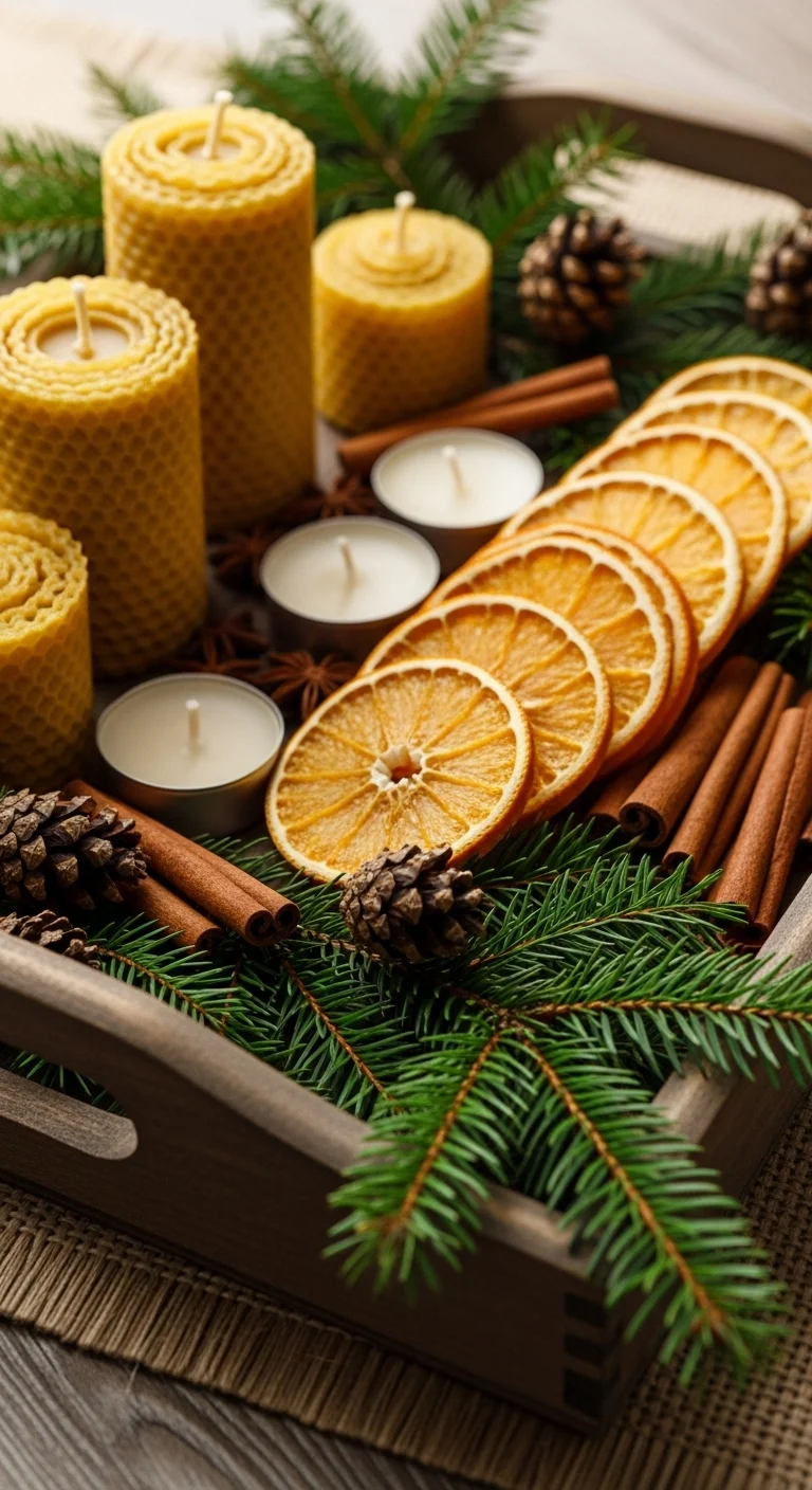 Create a natural scent display with orange slices, cinnamon sticks, and pine branches. Arrange them on a tray or simmer on the stove for fragrance. Add candles nearby for a cozy glow. It’s a simple sensory touch that makes your home feel instantly festive.