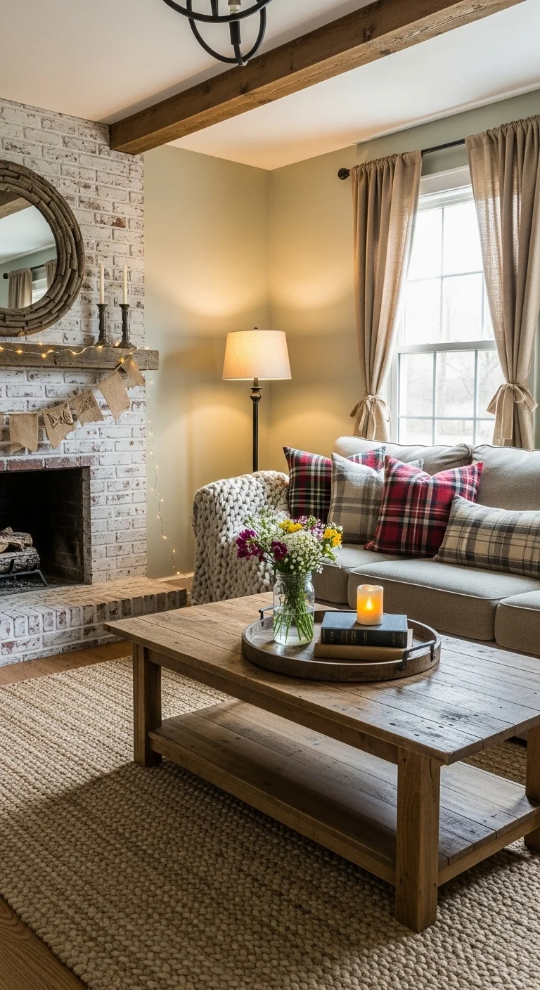 Bring farmhouse comfort into your home with wooden textures, plaid patterns, and natural greenery. Wrap mason jars with jute string for candleholders. Add galvanized buckets or wooden crates filled with ornaments. This decor feels homely and warm without needing expensive items—most can be DIYed from materials you already have.