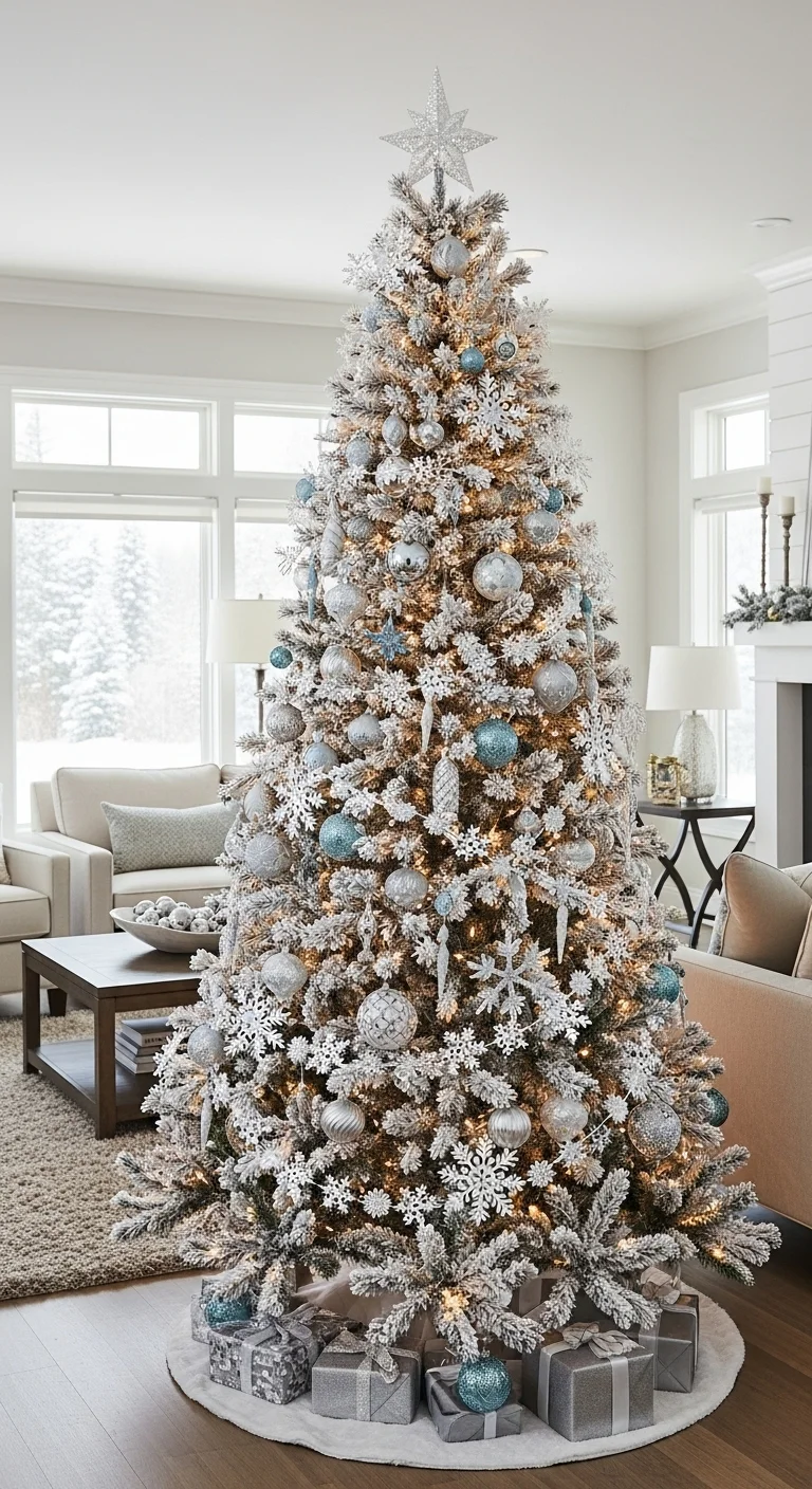 Cool tones bring a frosty charm. Decorate with blue, silver, and white ornaments for a wintery sparkle. Add glittery snowflakes and icy glass candleholders. You can DIY this look by painting old ornaments light blue and dusting them with glitter. Perfect for creating a serene, snow-inspired vibe.