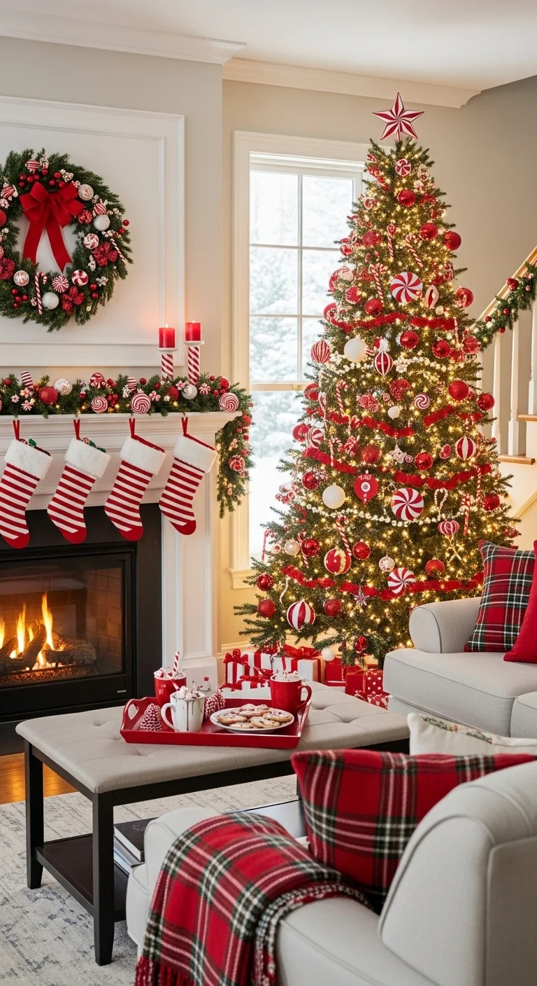 Traditional never goes out of style. Combine red ribbons, white ornaments, and candy canes for a timeless look. Add plaid pillows and red throws for extra coziness. DIY candy cane garlands or use real candy canes for ornaments. This cheerful combo instantly brightens the space.