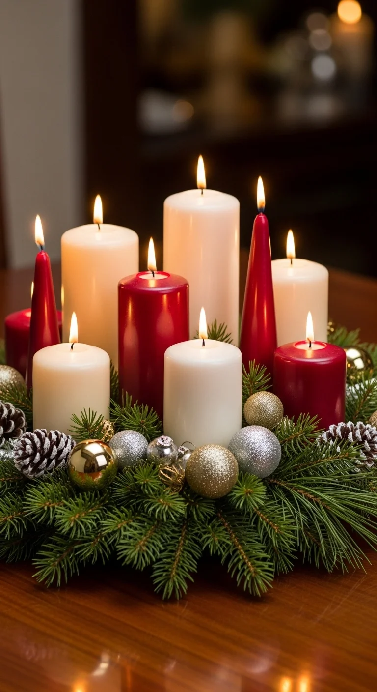 Create a candle centerpiece using candles of varying sizes. Place them on a tray surrounded by pine sprigs and small ornaments. Mix real and LED candles for safety. For fragrance, tie cinnamon sticks around the base with twine. This simple display works beautifully on dining tables or coffee tables.