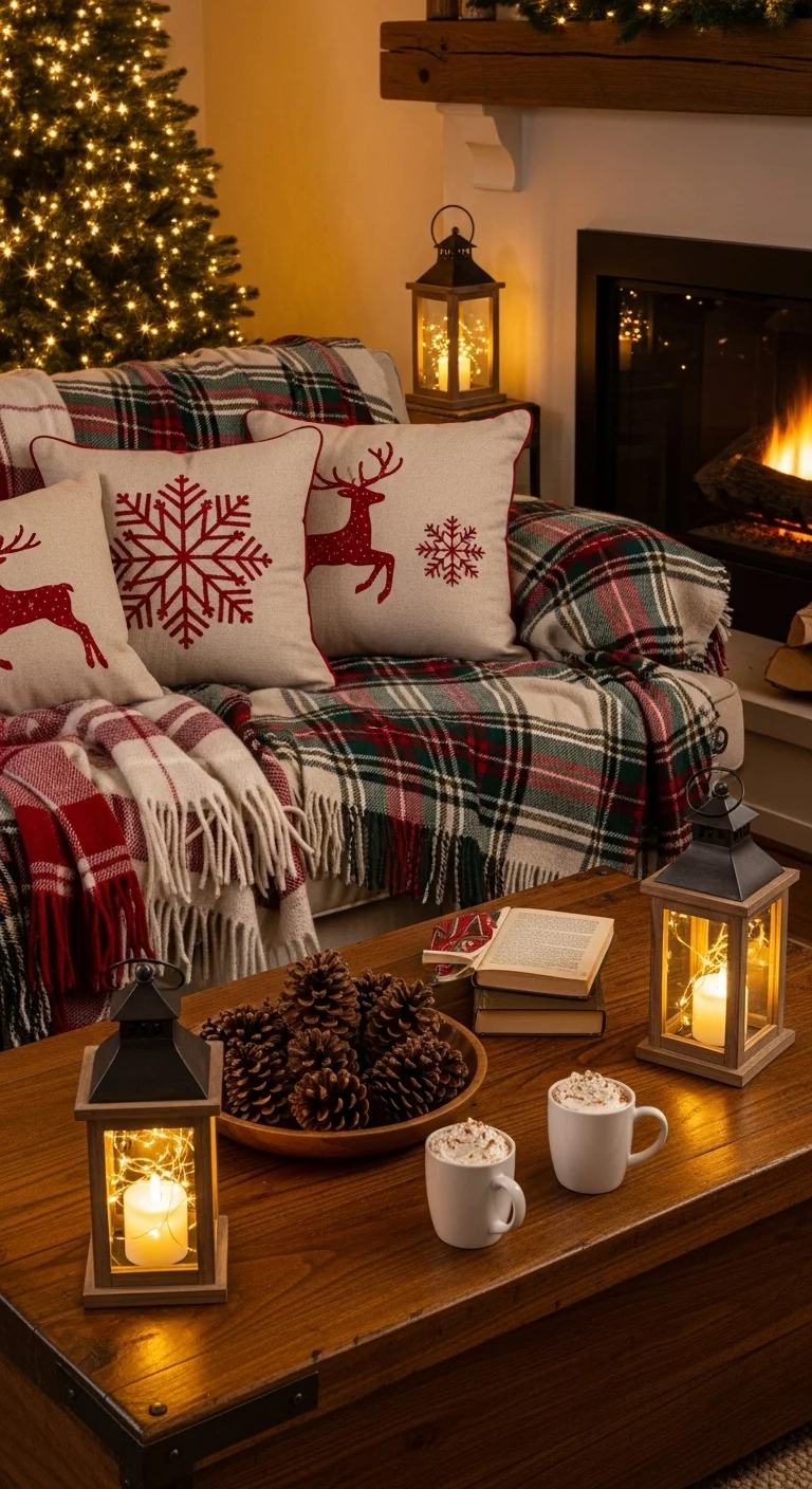 A simple basket of blankets can become charming decor. Stack cozy throws near the fireplace or sofa for easy access. Add a tag that says “stay warm” for a friendly touch. Use blankets in red, green, or cream to tie into your theme. It’s decorative and practical for cold nights.