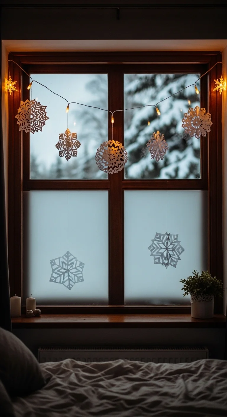 Dress your windows with paper snowflakes, light strings, or hanging ornaments. Cut out snowflakes from white paper or use ready-made ones. Tape them at different lengths to create a floating effect. Add a string of warm lights for a magical winter glow.