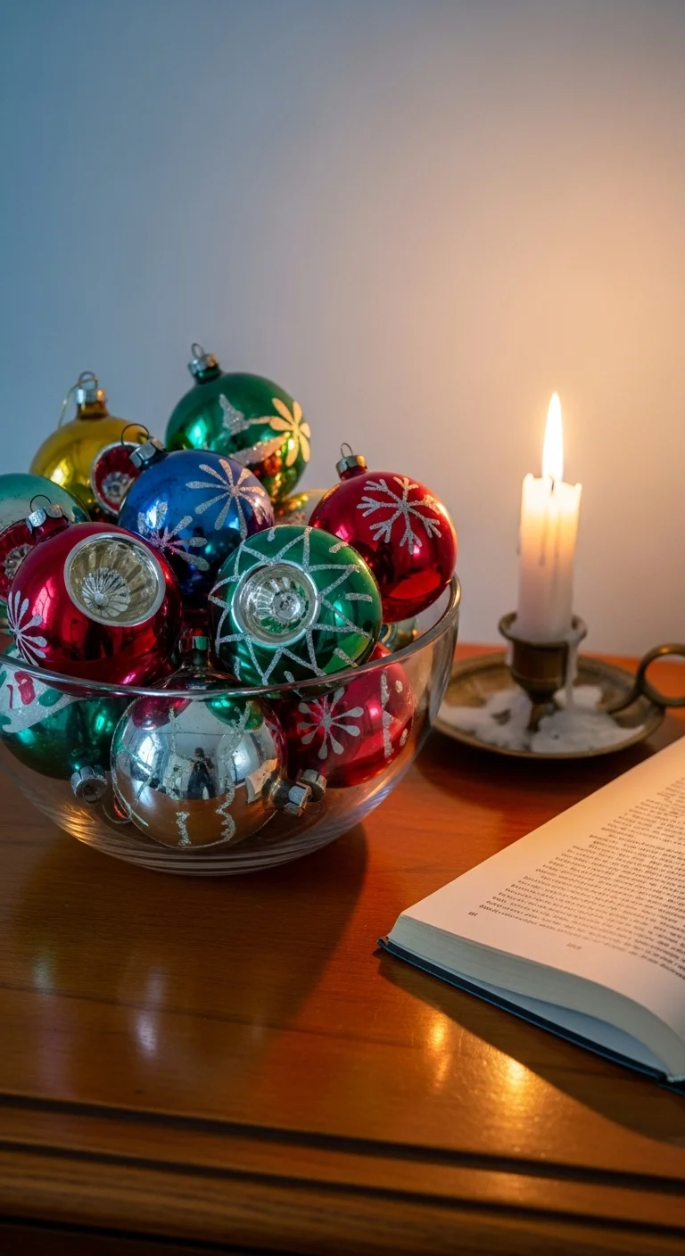 Display old ornaments in a clear glass bowl or tray. It’s a charming way to reuse decorations without hanging them. Mix metallic tones for sparkle or stick to one color for simplicity. Add a candle nearby for extra shine.