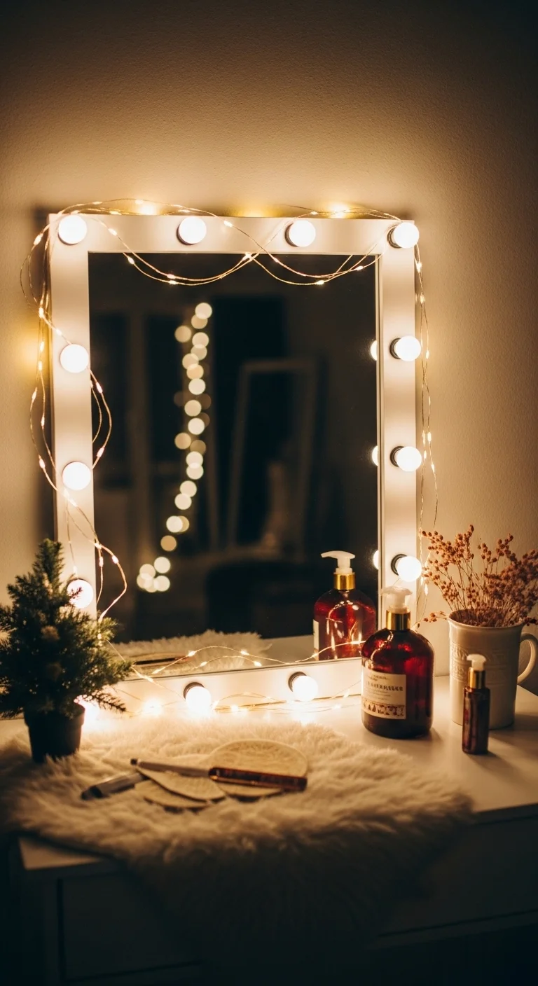 Wrap fairy lights around your mirror for a magical glow. It adds warmth and makes the room sparkle. Choose battery-powered lights for a clean look. You can also clip mini ornaments or pine branches along the wire for texture.