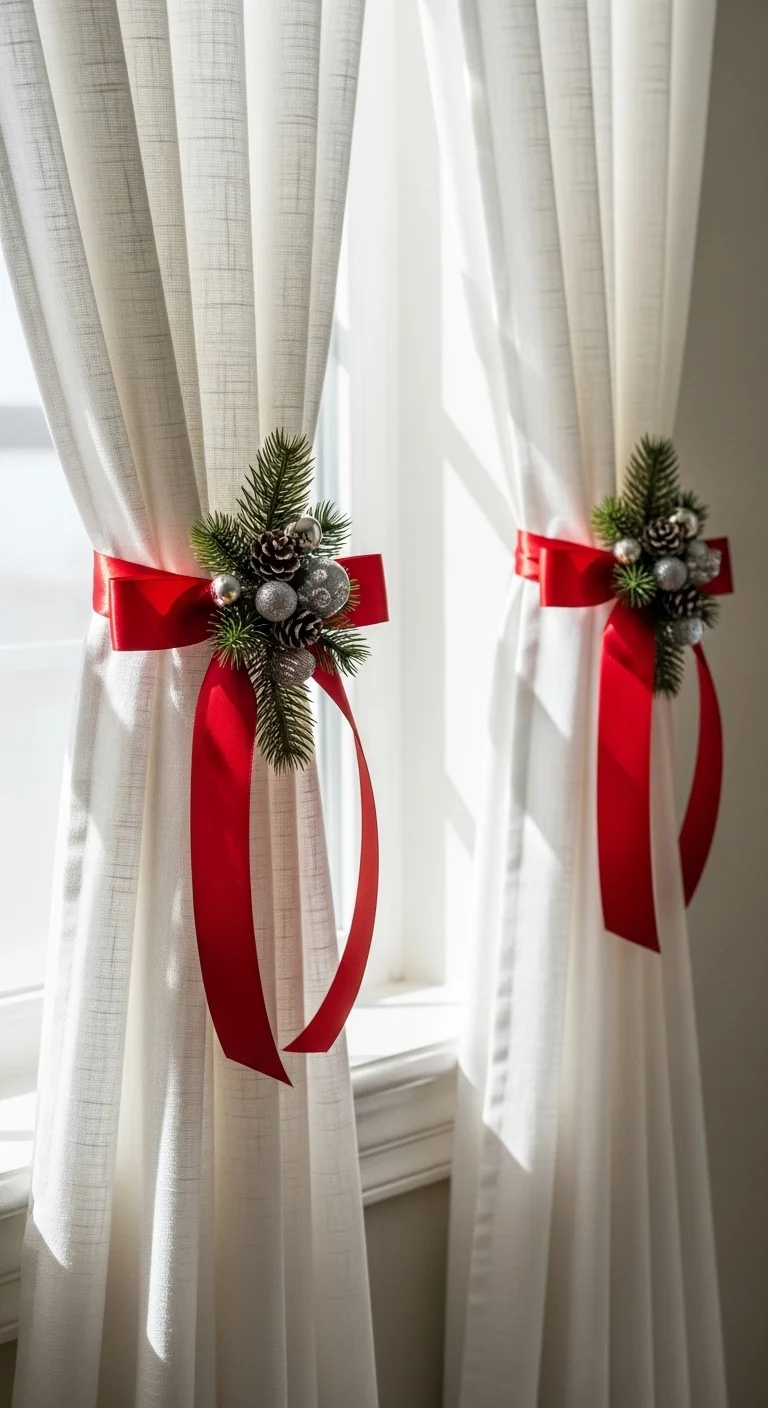 Replace your curtain tiebacks with ribbons and pine sprigs. Add small ornaments for sparkle. It’s a subtle way to bring Christmas charm into your room without changing much. Best part—it costs almost nothing.
