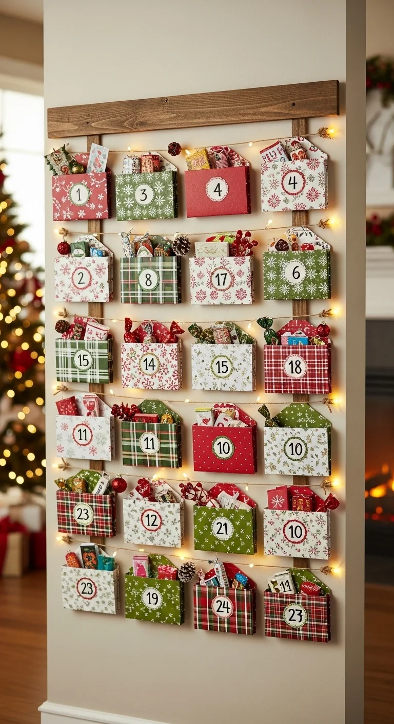 Create your own Advent calendar using small envelopes or paper bags. Hang them on a string with mini clothespins. Fill each with treats or tiny notes. It’s a fun project and doubles as decor.