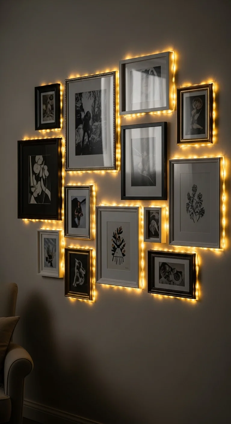 Outline your picture frames with fairy lights. It adds sparkle and highlights your favorite memories. You can even clip Christmas cards onto the lights for an extra personal touch.