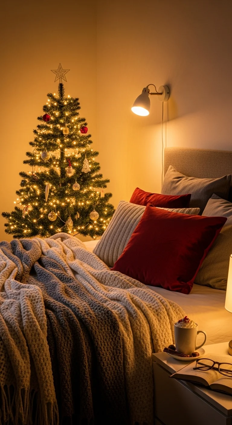 Swap out your regular sheets for holiday-themed bedding. Think red plaid, snowflake prints, or soft flannel textures. Add a chunky knit throw and a couple of Christmas cushions. If you don’t want to buy new bedding, just fold a festive blanket across the foot of the bed for the same cozy effect.