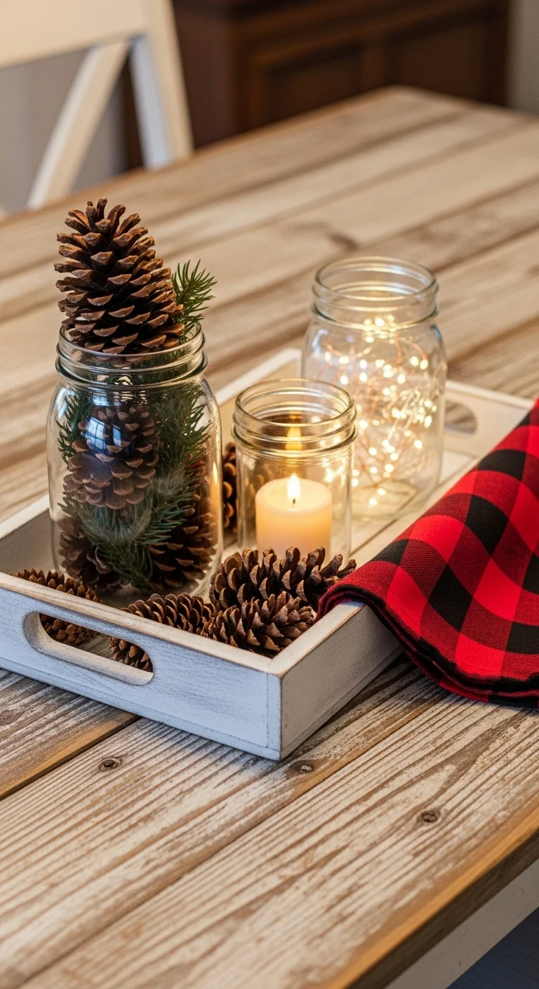 Go for a rustic farmhouse vibe with a simple wooden tray. Add mason jars filled with greenery, pinecones, and small candles. Drape a plaid napkin inside for texture and warmth. A small “Merry Christmas” sign or buffalo check ribbon ties the look together. For an easy DIY, paint an old serving tray white and distress the edges with sandpaper for that farmhouse charm.