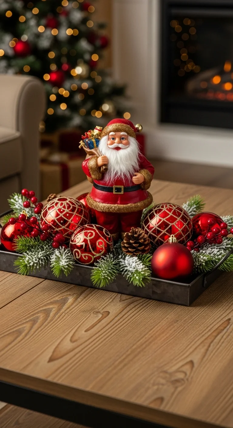 Keep it traditional with red and green accents. Add small ornaments, a Santa figurine, or a red candle. A touch of plaid ribbon ties everything together. This look never goes out of style and fits into any room.