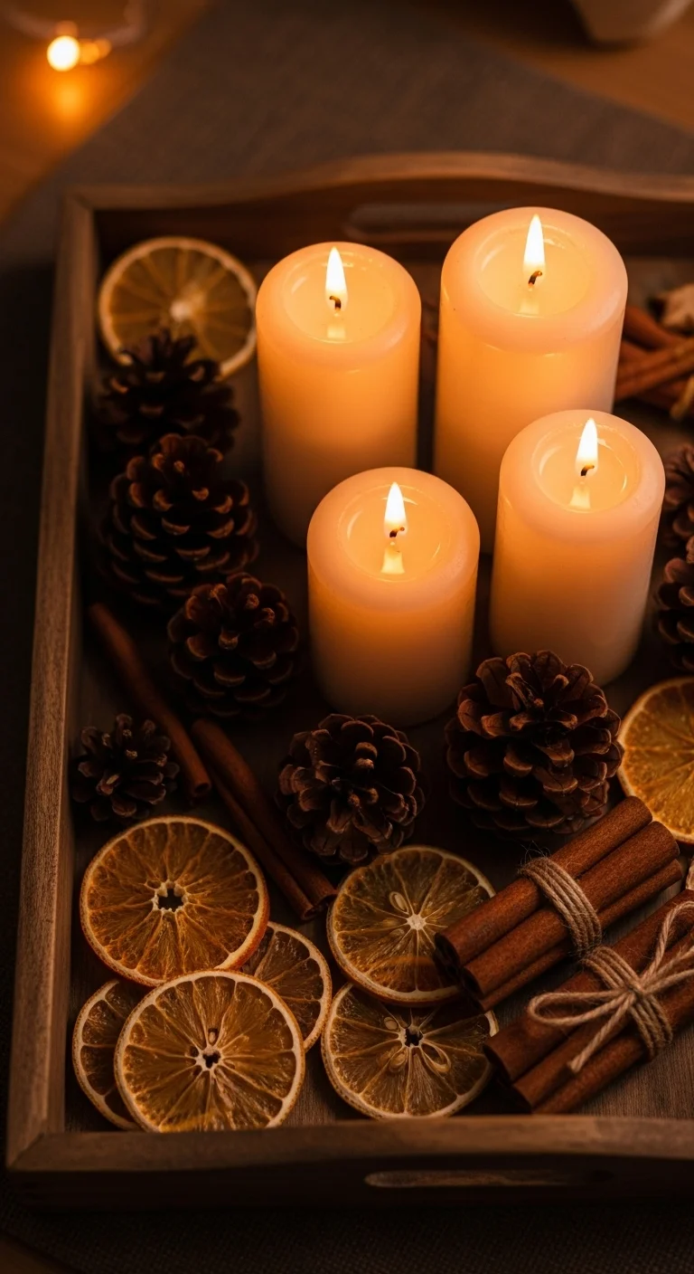 Fill your tray with scented candles, dried citrus, and cinnamon sticks. The mix of aroma and visuals creates a warm ambiance. Place it in your living room or bedroom for instant coziness. Affordable and simple, it adds life to any space.