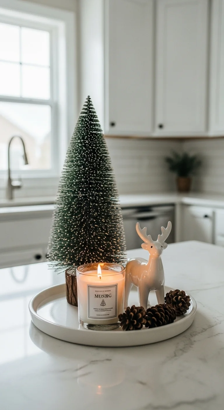 Add holiday cheer to your kitchen with a decorative counter tray. Use a cutting board or metal tray and fill it with everyday items like salt shakers and hand soap. Mix in a small Christmas tree, candle, or reindeer figurine for a seasonal touch. This idea keeps your kitchen functional but festive.