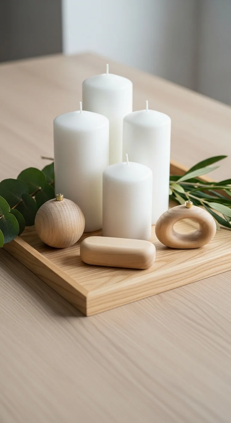 For a clean, Scandinavian-inspired look, go minimal. Choose a plain wood or white tray and add simple decor—think white candles, eucalyptus sprigs, and wooden stars. Stick to neutral colors with hints of green. This idea feels peaceful and stylish, perfect for modern spaces.