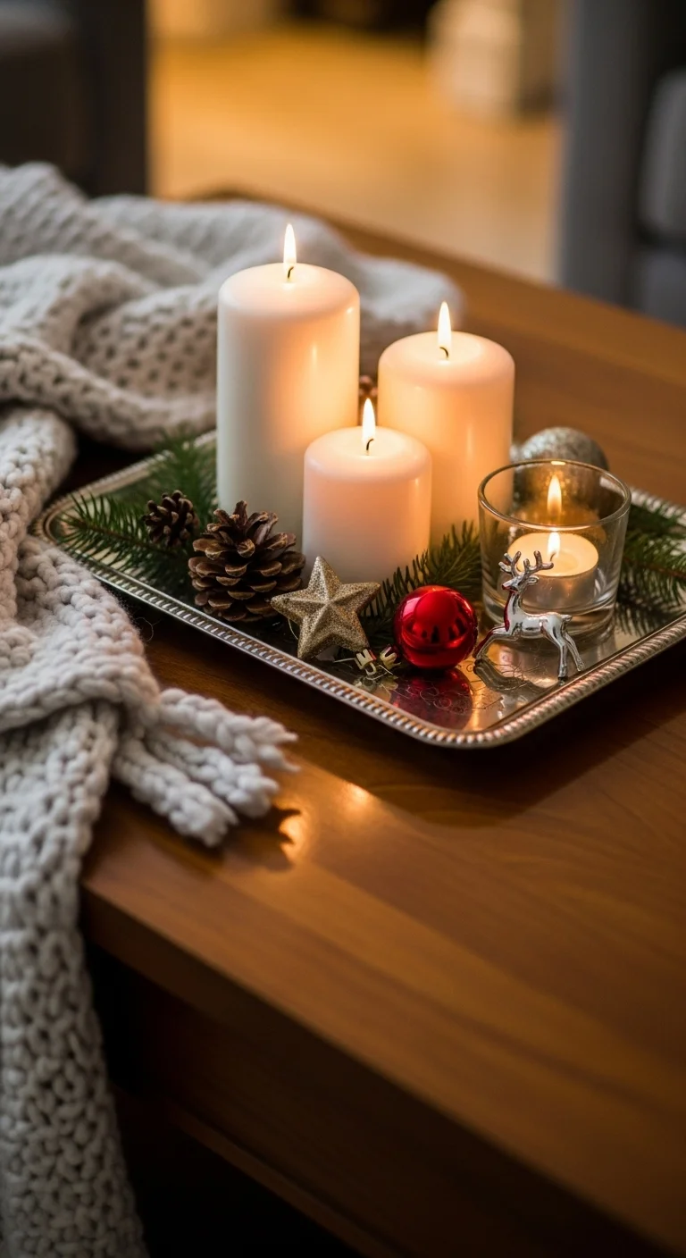 Fill your tray with candles of varying heights for a warm, glowing centerpiece. Surround them with small ornaments, pine branches, or faux snow. Stick to a color theme like white and gold for elegance. If you prefer safety, use LED candles for the same cozy glow without worry. This setup adds instant warmth to any room.
