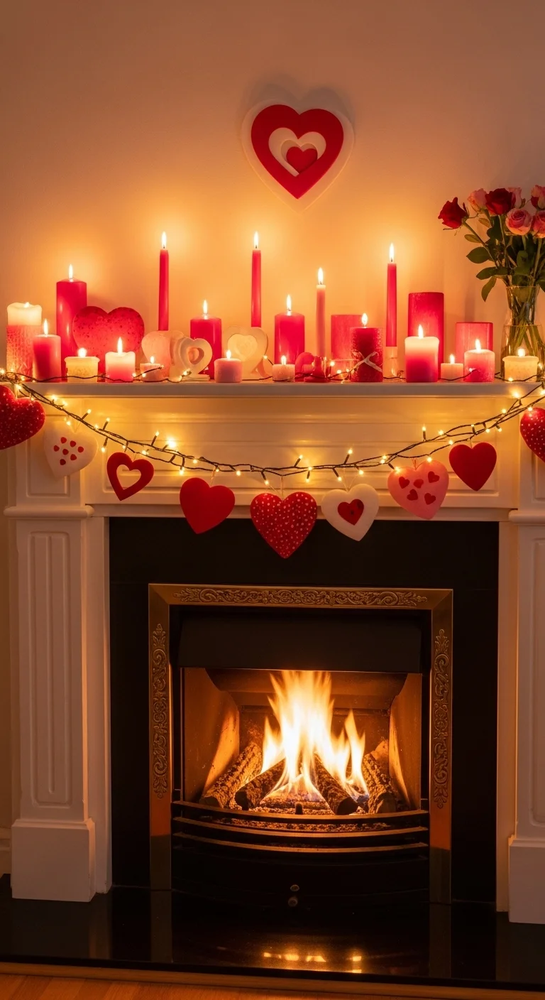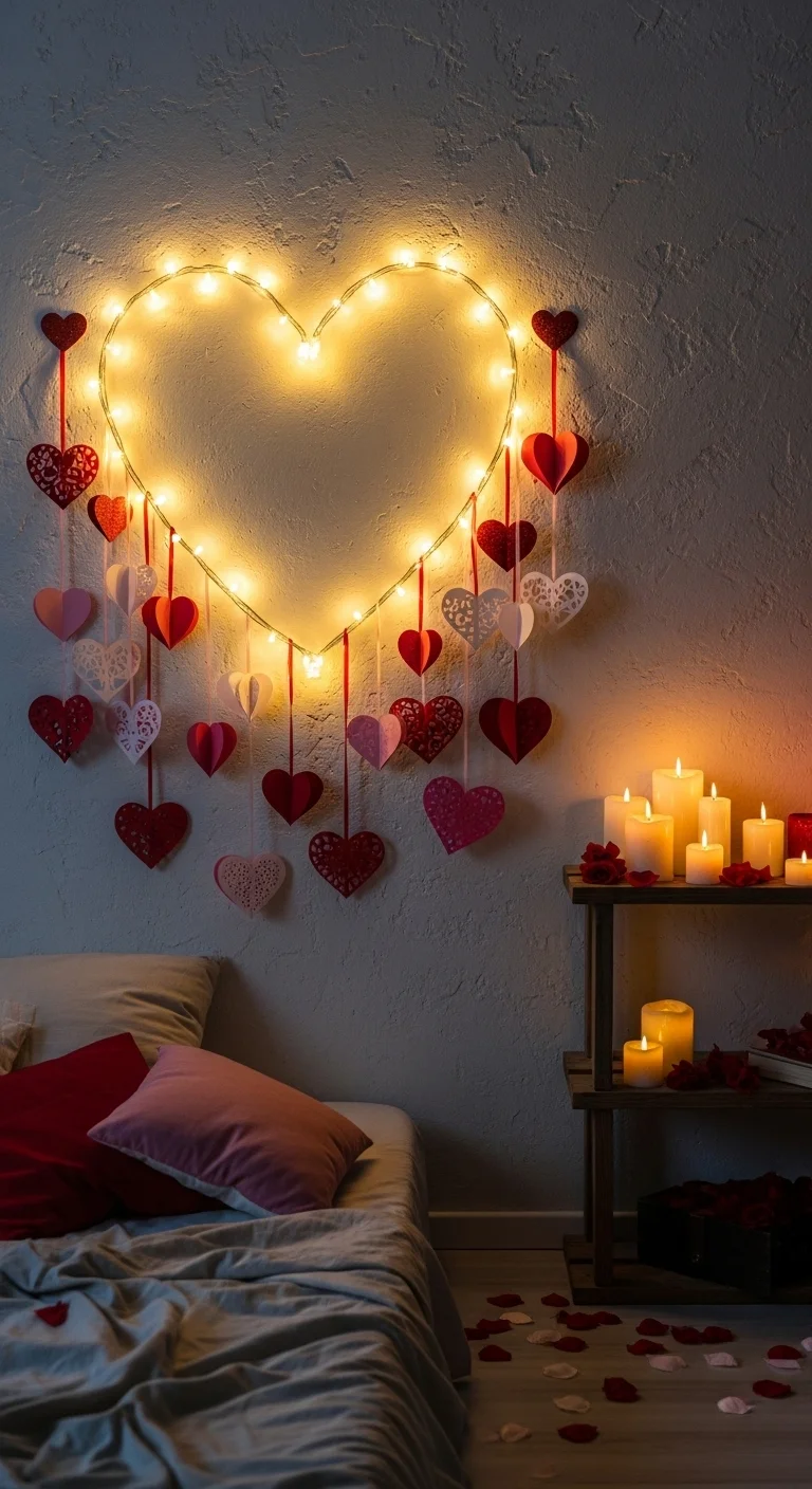 Transform your walls or windows into twinkling Valentine backdrops using fairy lights. This works beautifully for photos, cozy evenings, or accenting a feature wall.