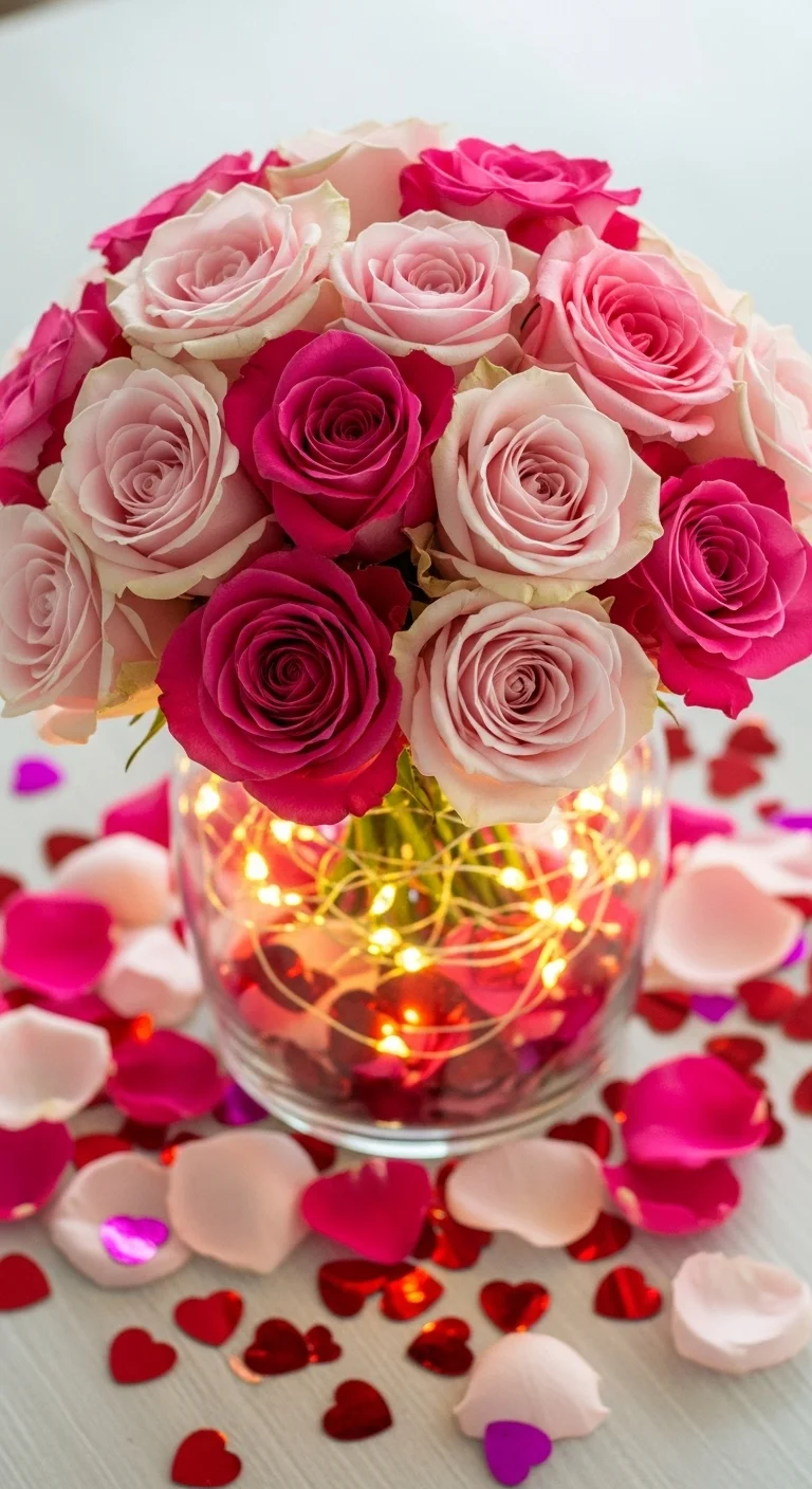 • Coil lights inside a glass vase with flowers or heart-shaped decor