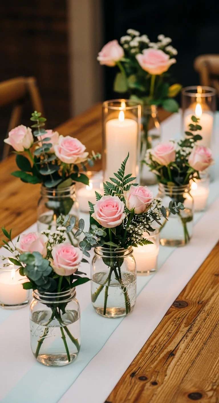 - Cluster candles and small vases for a focal point