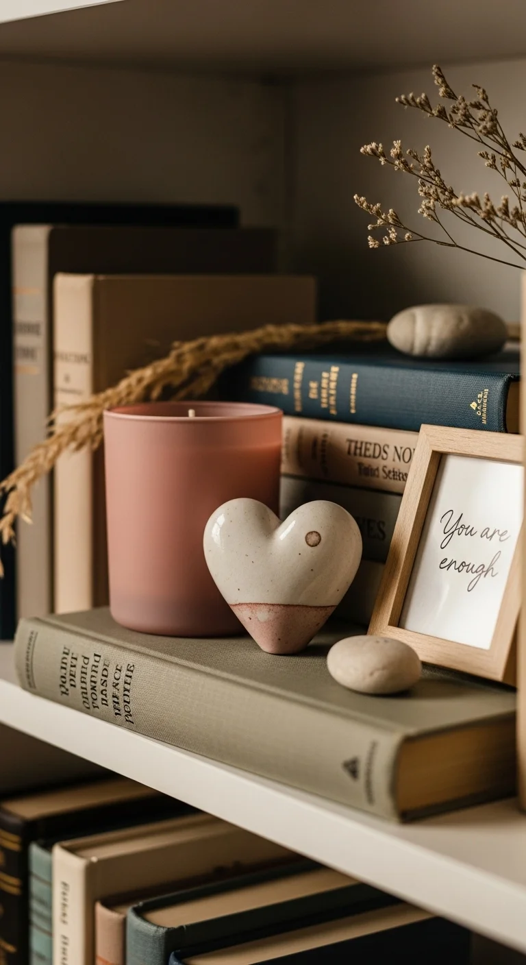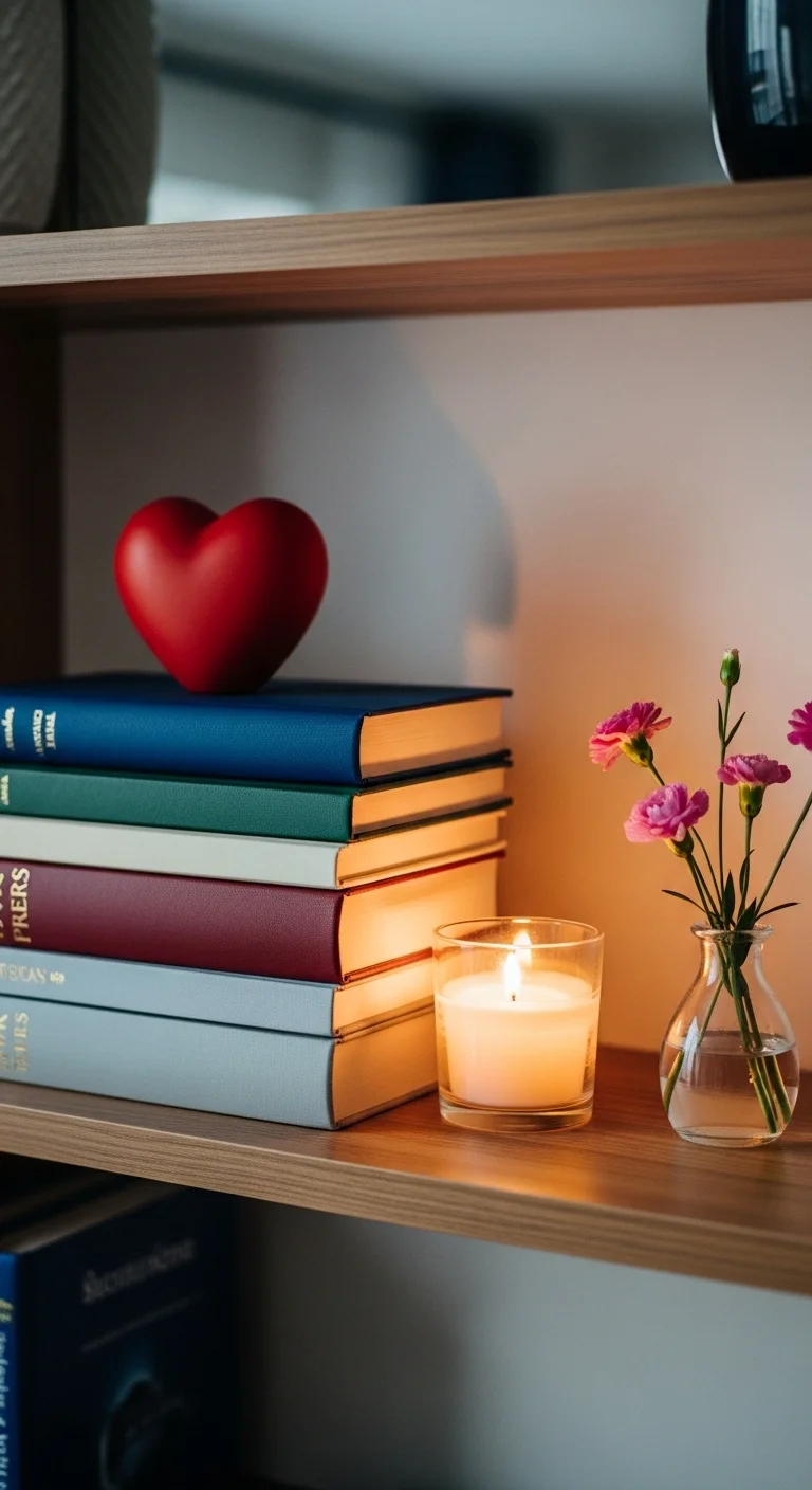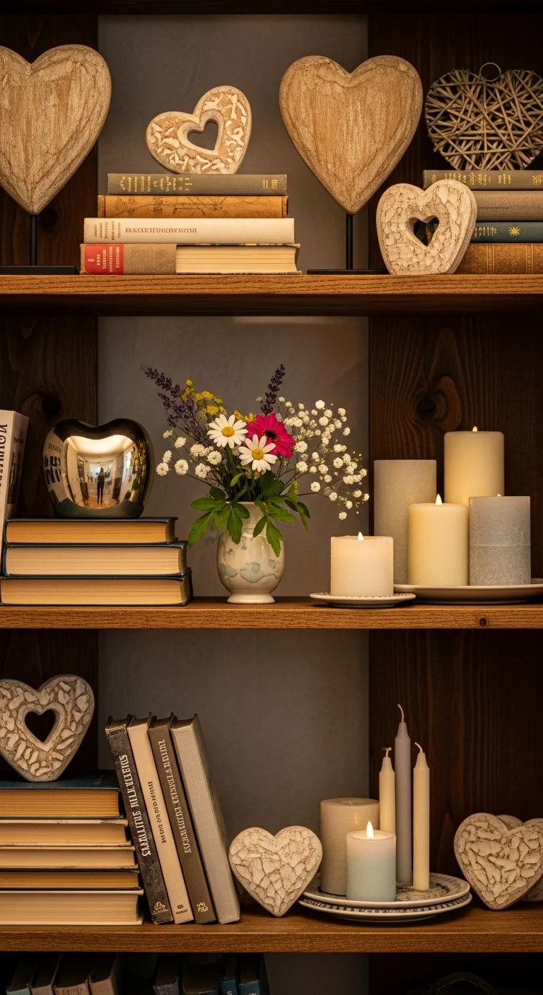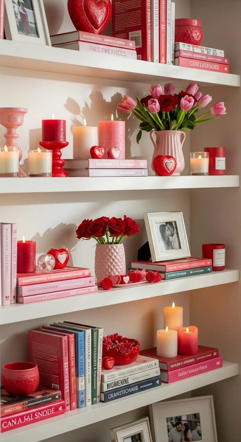 Whether you’re decorating a living room bookshelf, a kitchen ledge, or a bedroom display, the key is layering, balance, and subtle Valentine’s touches.