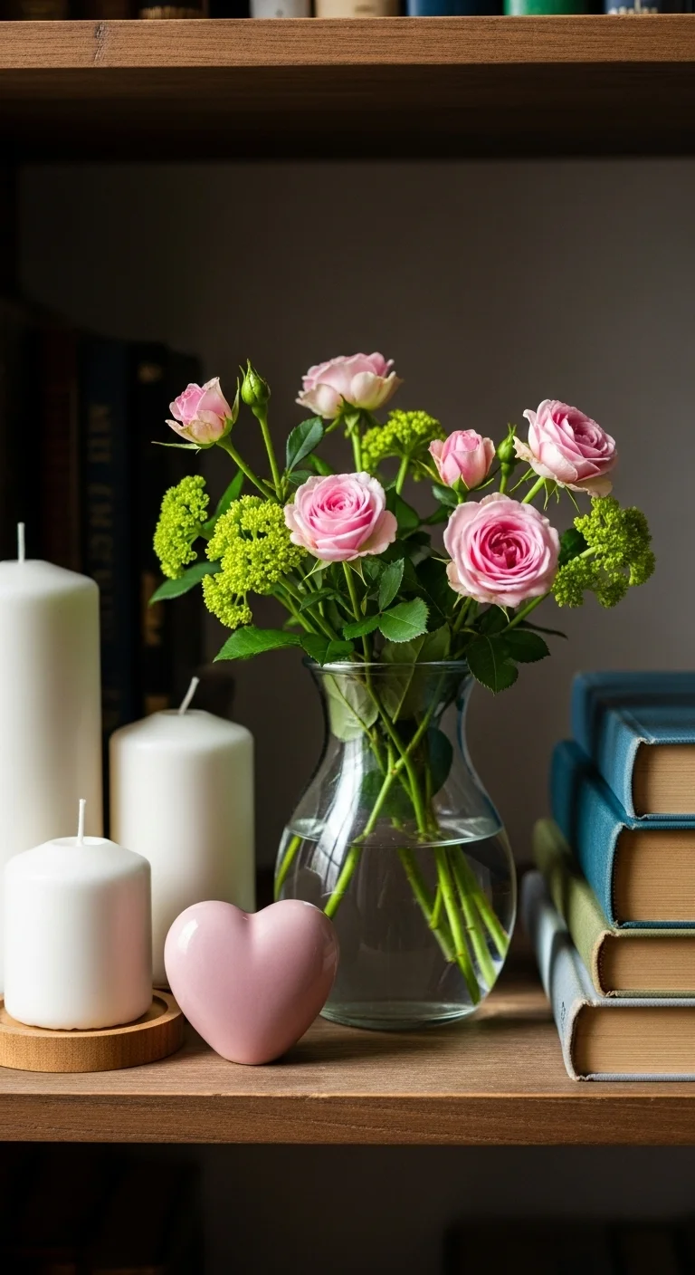 Adding fresh or faux elements like flowers, greenery, or branches brings life and texture to your Valentine shelves.