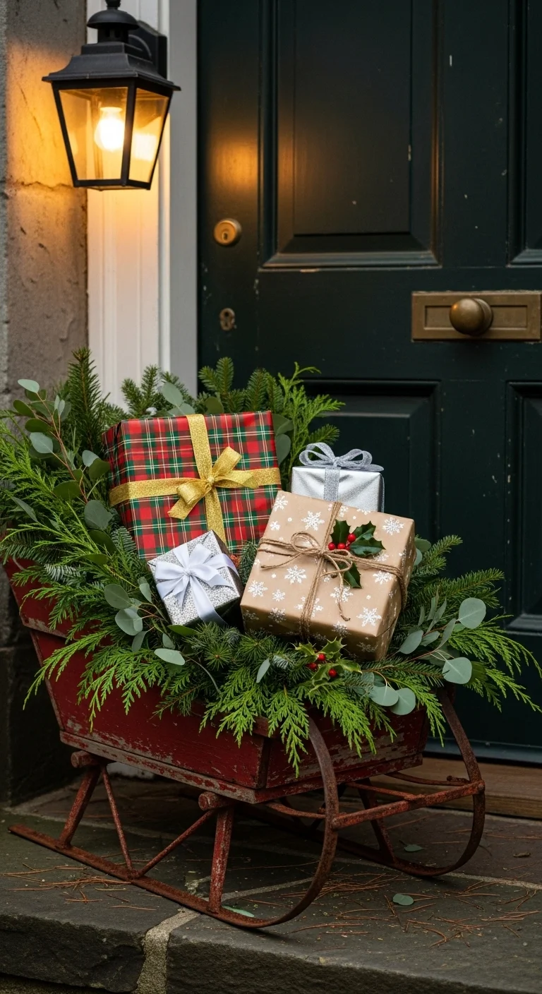 Decorate with a vintage sleigh for instant nostalgia. Fill it with greenery, pinecones, or wrapped gifts. It works beautifully on porches or by the fireplace. You can even build your own using scrap wood for a personal touch.