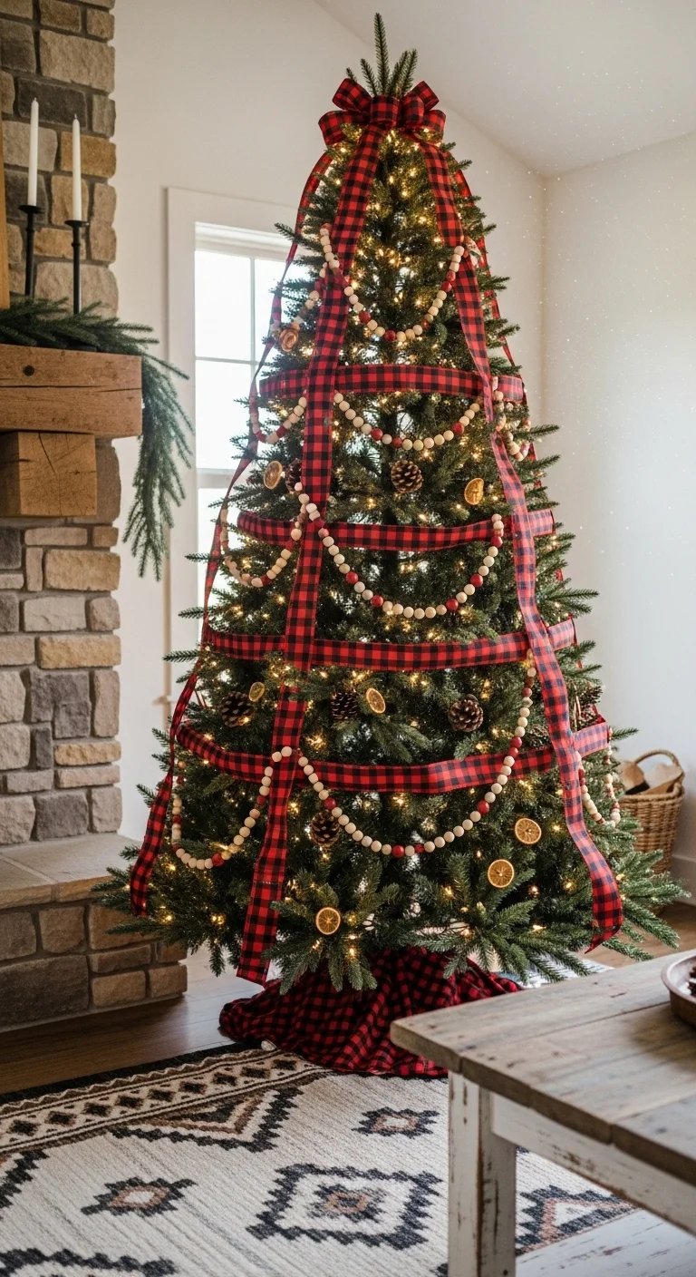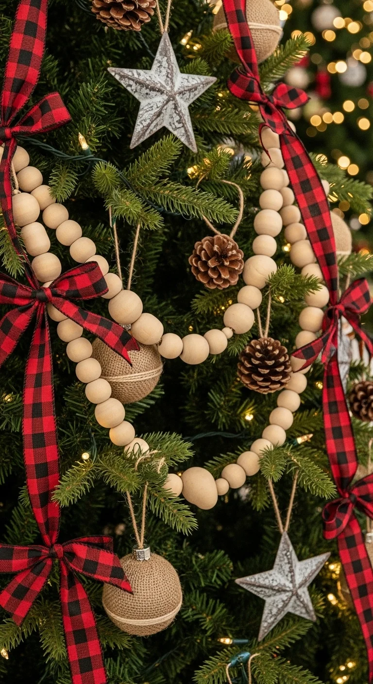 Wrap your Christmas tree in plaid ribbon instead of tinsel. Combine it with wooden bead garland and simple ornaments. The result is warm, cohesive, and classic farmhouse. It ties your entire decor theme together beautifully.
