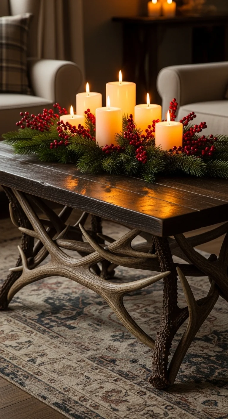 Add antler decor to your centerpiece or mantel. Use faux versions for safety and sustainability. They bring that country lodge charm without feeling overdone. Pair with candles and pine sprigs for a soft, rustic balance.