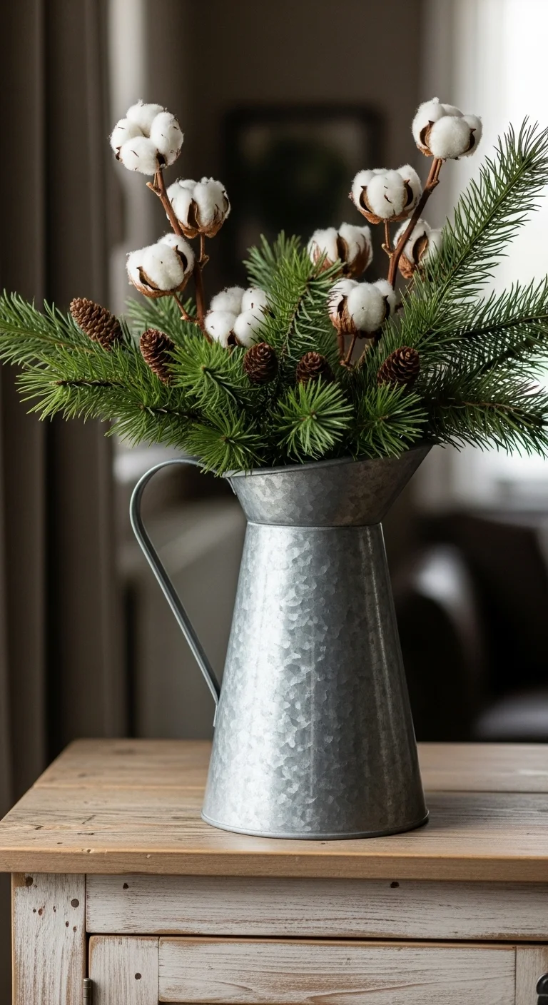 Mix cotton stems with pine branches in a galvanized pitcher or old milk jug. The white cotton pops beautifully against greenery. It’s a simple farmhouse staple that brings texture and a natural touch indoors.