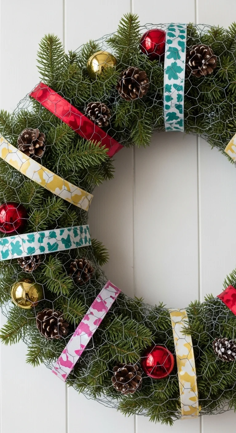 For a creative twist, make a chicken wire wreath. Cut the wire into a circle and weave in pine branches, ribbon, and small ornaments. It’s a fun farmhouse craft that adds personality to your front door or kitchen wall.