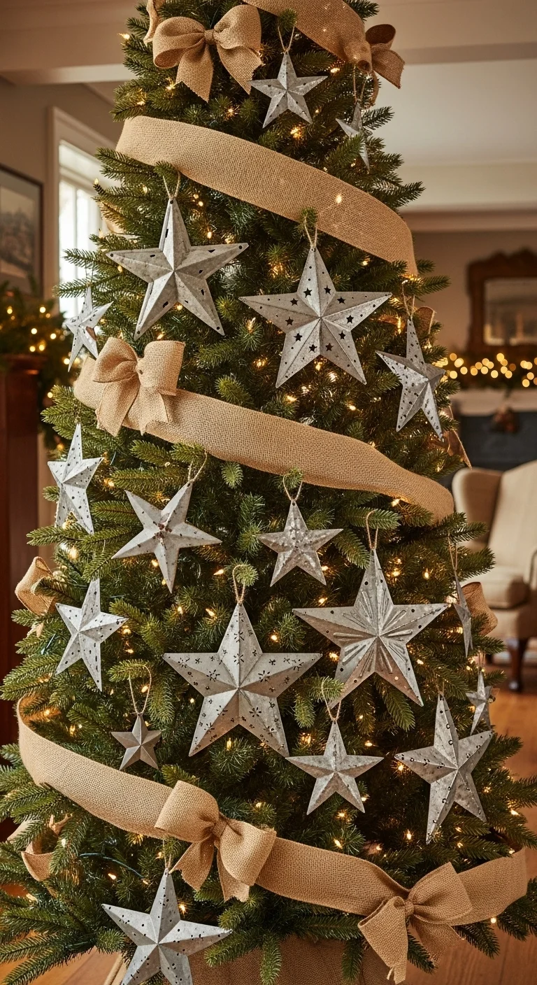Hang tin star ornaments on your tree for that old-country touch. Their matte silver finish pairs well with burlap ribbon or twine. You can make your own with metal sheets or repurpose cookie tins — easy and affordable.