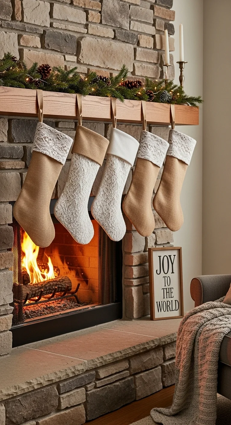 Swap shiny fabrics for burlap and lace stockings. The mix of rough and delicate textures fits perfectly in a farmhouse setting. Add wooden name tags or sprigs of greenery for a simple finish. You can sew your own using scrap materials — affordable and full of charm.