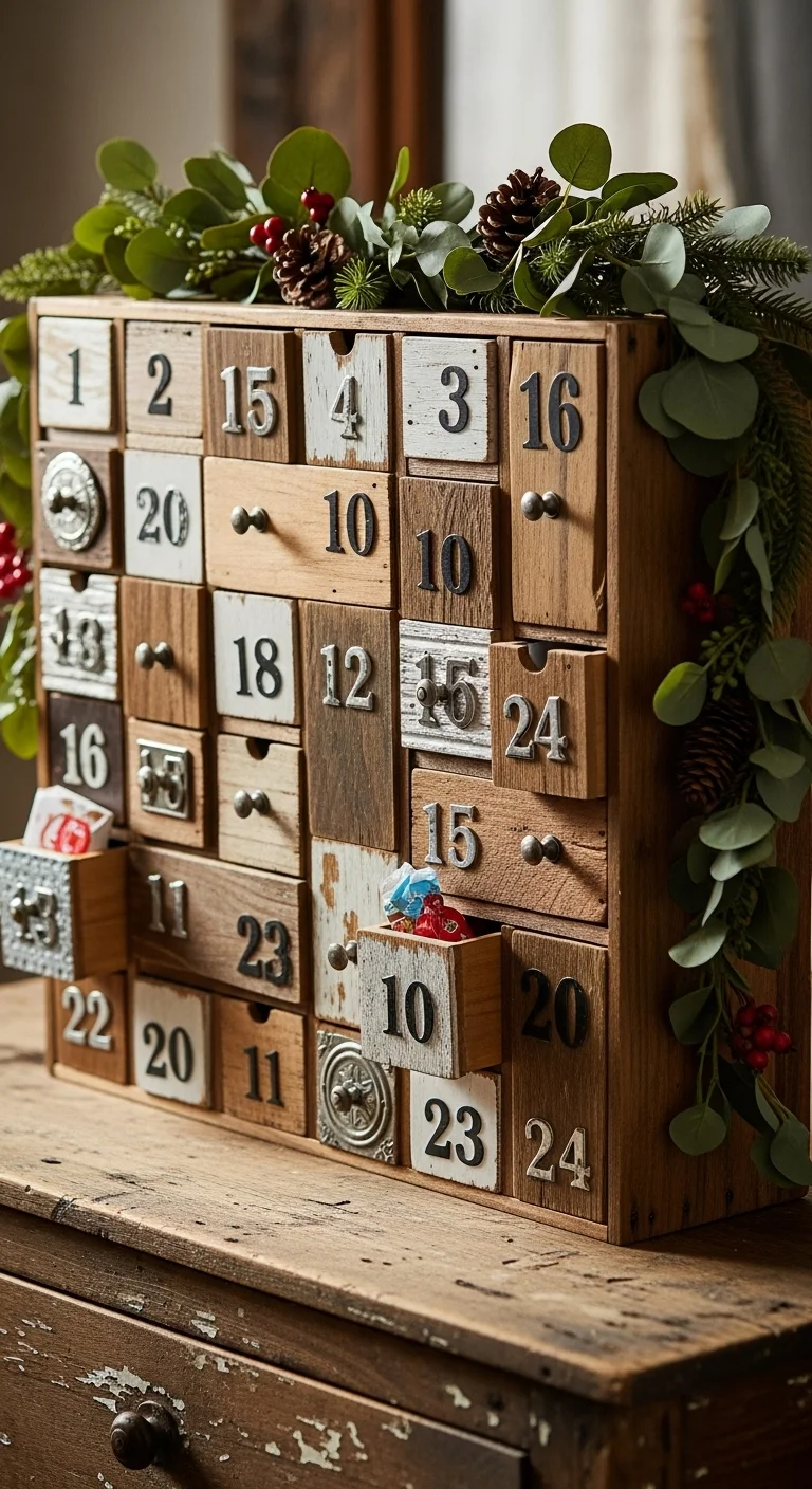 Build an advent calendar from reclaimed wood. Attach mini buckets or drawers numbered 1–25. Fill each with treats or ornaments. It’s a fun, meaningful way to celebrate and adds rustic beauty to your wall.