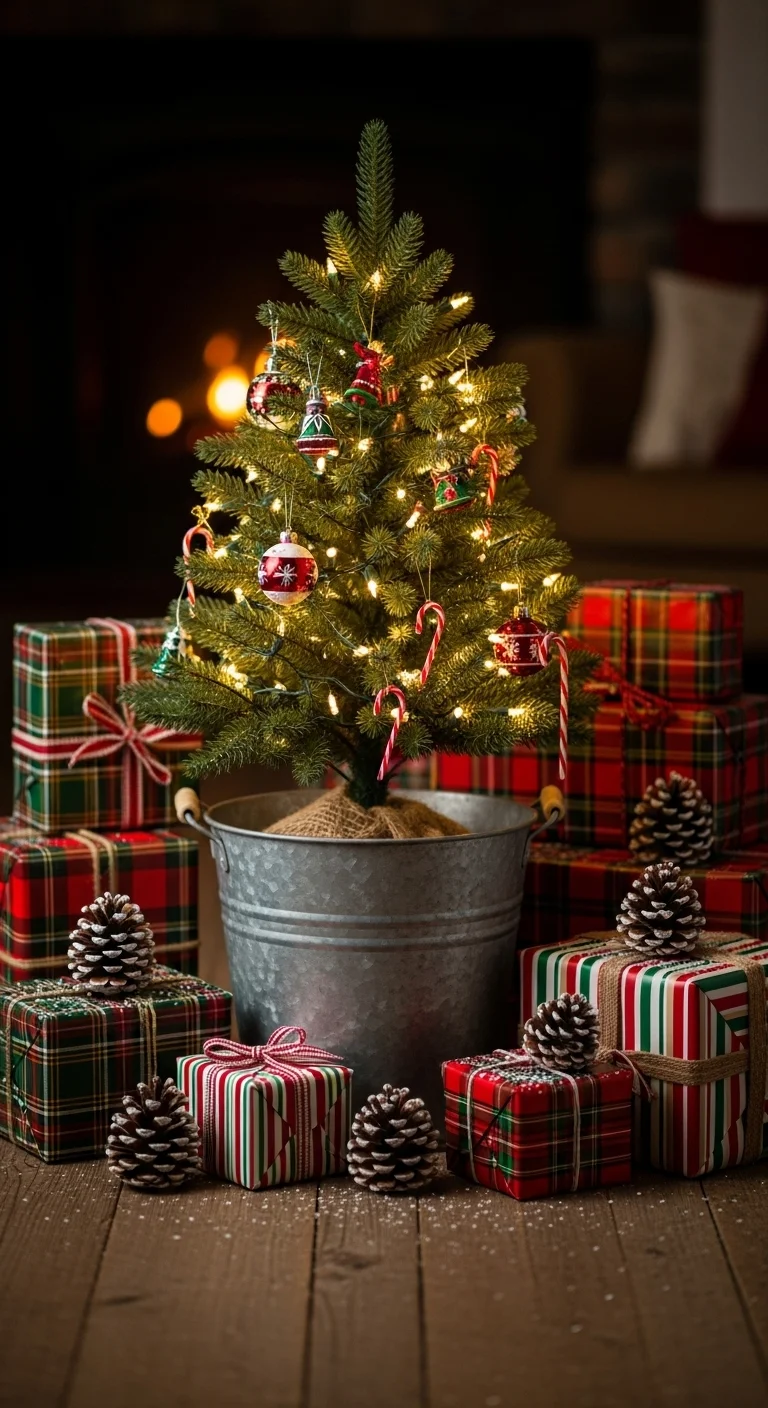 Skip the traditional tree skirt and use a galvanized bucket instead. It instantly gives your Christmas tree a rustic farmhouse vibe. Line the inside with a blanket or burlap for stability. It’s functional, stylish, and takes minutes to set up.