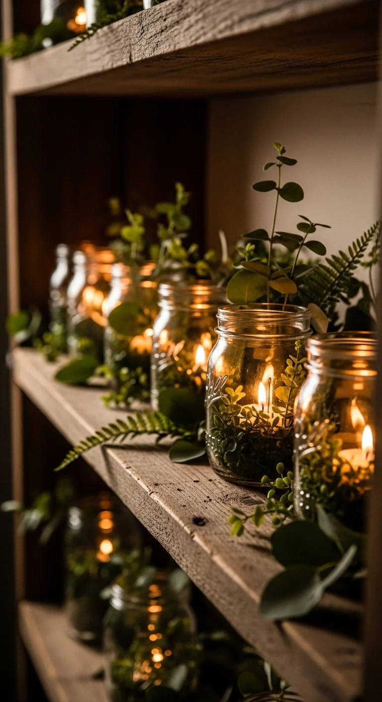 Mason jars are farmhouse staples. Fill them with Epsom salt (fake snow) and place tea lights or small candles inside. Add sprigs of cedar or cinnamon sticks for scent. These simple candle holders look charming on mantels or windowsills.