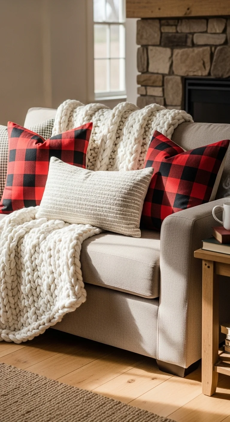 Add buffalo check pillows to your couch or armchair. This classic pattern screams farmhouse charm. Pair with knit blankets for texture. You can find affordable covers online or sew your own from flannel fabric.