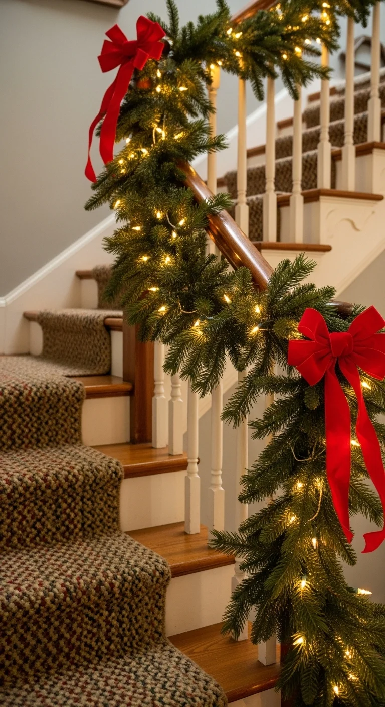 Wrap pine garland along your staircase railing. Add fairy lights and red ribbons for color. Use faux greenery if you prefer easy cleanup. This simple detail fills the house with a fresh, cozy feeling every time you walk by.