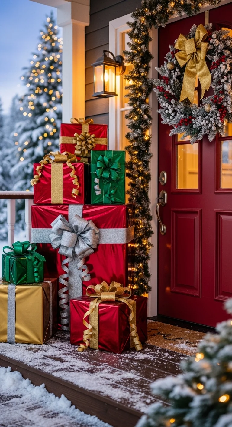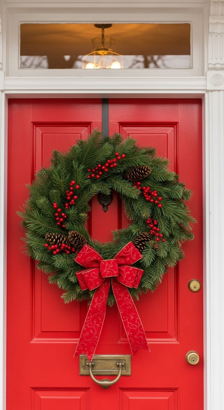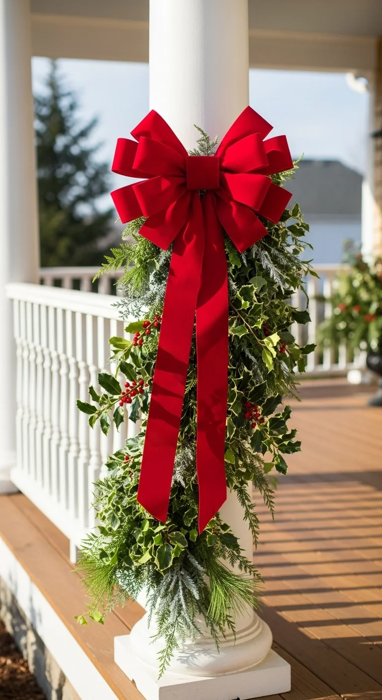 Tie a large red bow around a pillar, post, or railing for a bold statement. Add matching ribbons on the door or wreath to create cohesion. It’s simple but attention-grabbing.