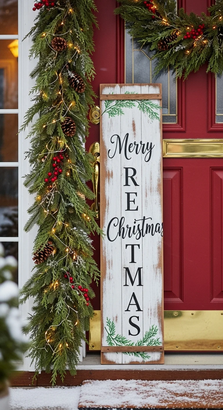Lean or hang a holiday-themed wooden sign near your entrance. Paint one yourself for a budget-friendly craft. Use seasonal words like “Joy,” “Believe,” or “Merry Christmas.”