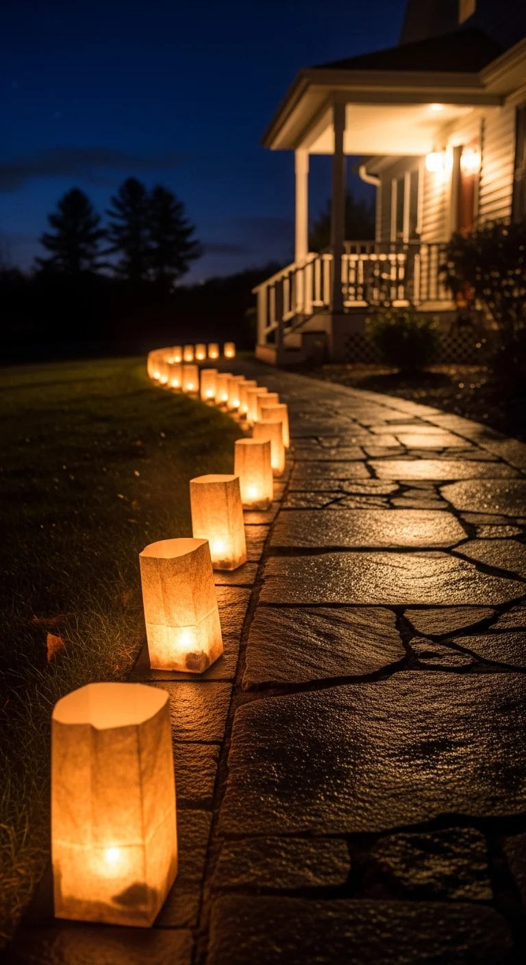 Line your walkway with luminaries. Use LED tea lights in paper or glass holders. It guides guests to your glowing porch safely and beautifully.