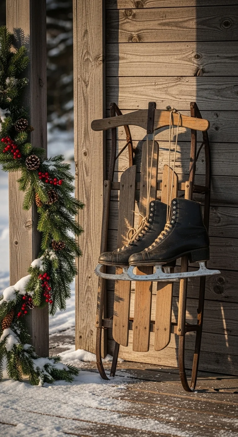 Prop a vintage sled or a pair of old skates near your door. Add greenery or ribbon for nostalgia. It gives your porch a charming, old-fashioned feel.