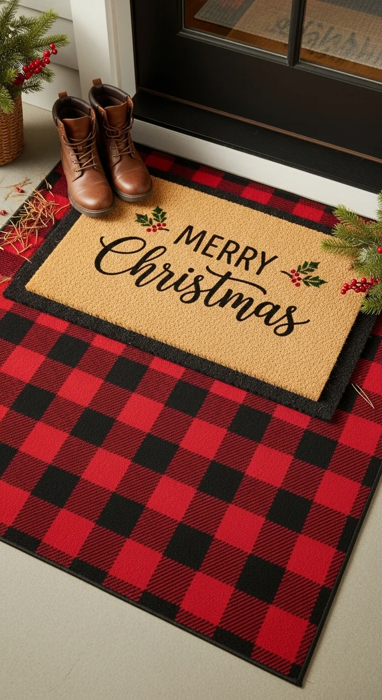 Layer your welcome mats for visual interest. Start with a patterned base like plaid, then add a festive message mat on top. It’s an easy, inexpensive trick that feels custom.