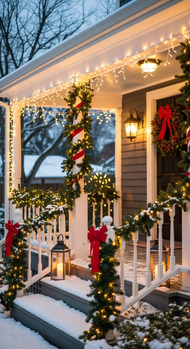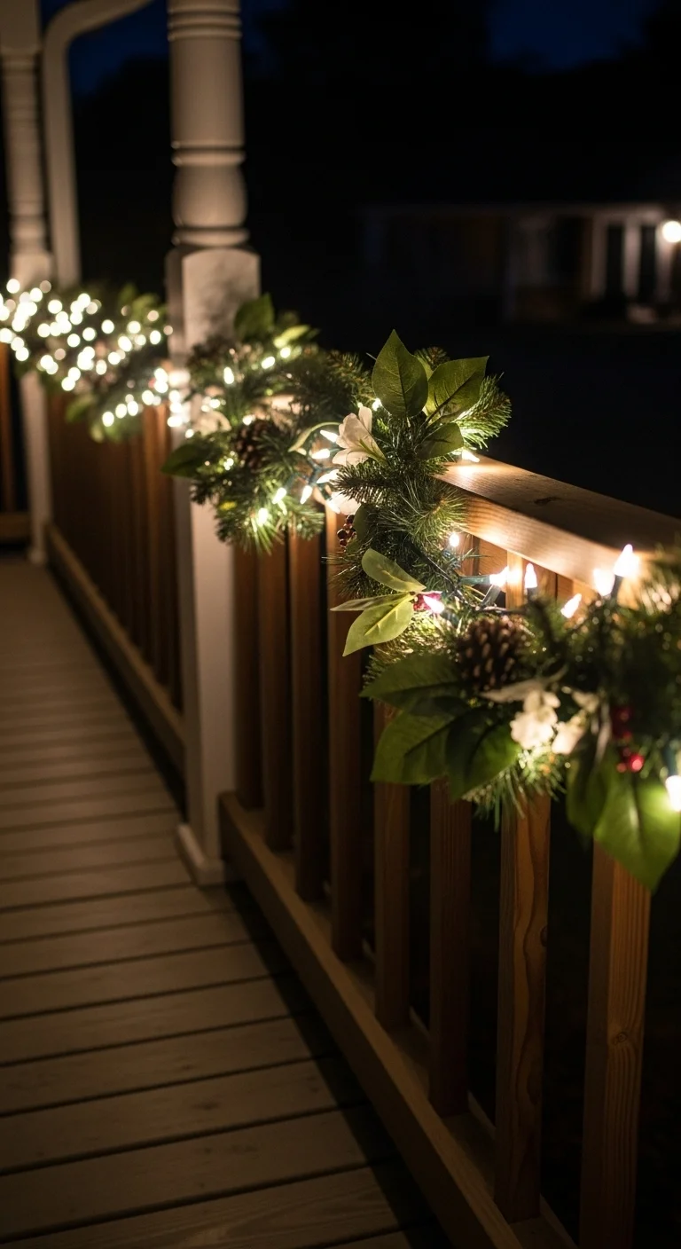 Instead of a full wrap, try swagging garland along your railings. Secure the middle with ribbon bows. It adds a softer, elegant curve that frames your porch beautifully.