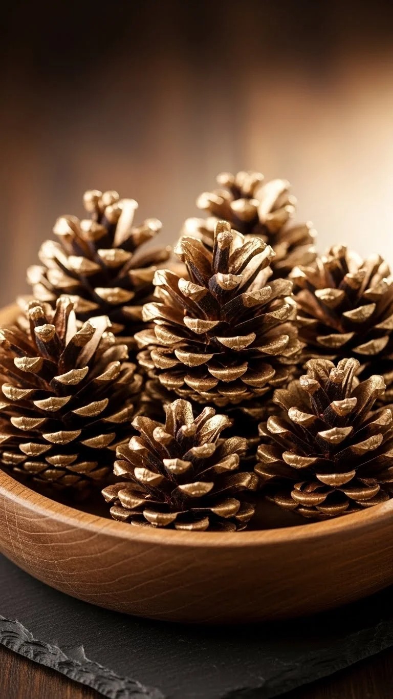 Transform ordinary pinecones into gold-tipped treasures for your mantel or table centerpiece. Simply dip the tips in gold paint or use metallic spray. Arrange them in bowls, trays, or incorporate them into wreaths. This is a budget-friendly way to add shimmer and texture. Pinecones also bring a natural element, balancing the glam gold for a chic yet cozy look.