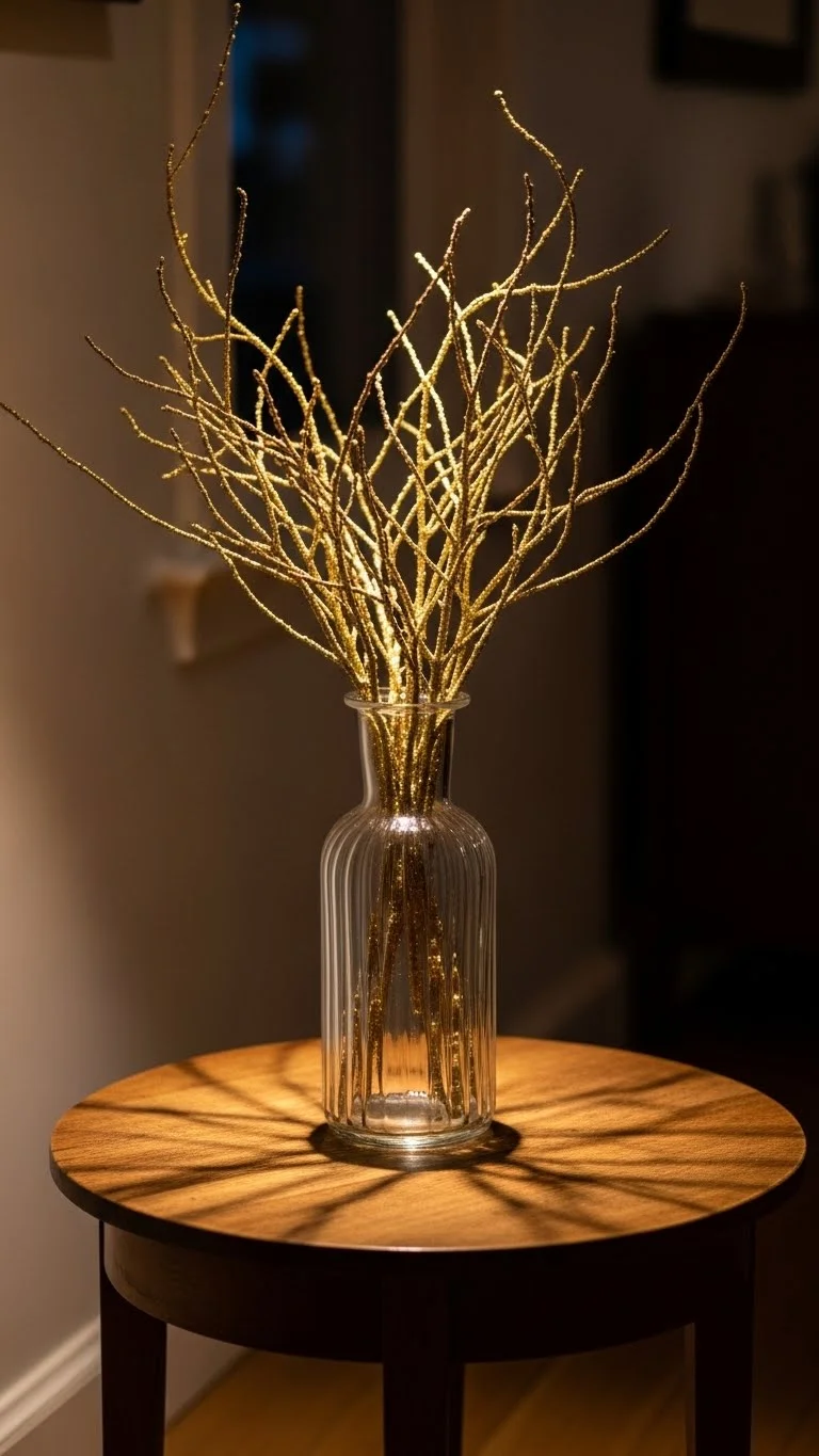 Decorate branches with gold glitter for a simple, shimmering display. Place them in tall vases or jars. Combine with fairy lights or small ornaments for a fuller look. Glittered branches are inexpensive and instantly add a festive, modern touch to your decor. They can be reused annually with minor touch-ups.
