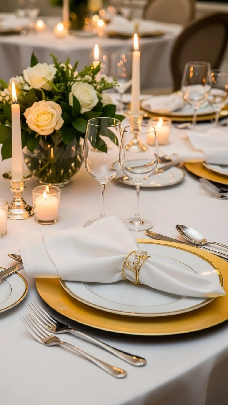 Use gold napkin rings for a subtle yet chic dining table accent. Pair with neutral or white linens to let the gold shine. Affordable DIY options include spray-painting existing rings or using metallic ribbon tied in a loop. Small touches like this tie together the table setting and make meals feel festive.