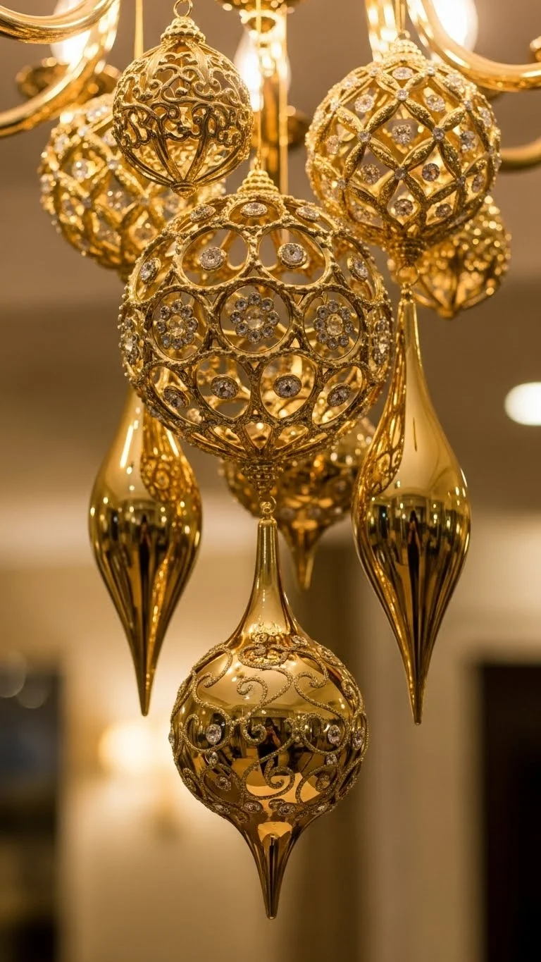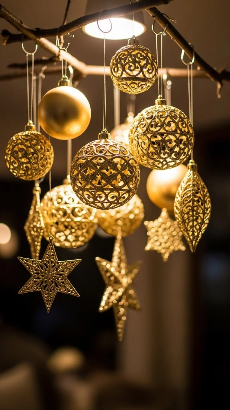 Hang gold ornaments from a chandelier or light fixture for a dramatic, eye-catching effect. Use fishing line or ribbon to suspend them at varying heights. This adds sparkle overhead and elevates ordinary fixtures into glamorous decor elements. It’s a simple, budget-friendly DIY with high visual impact.