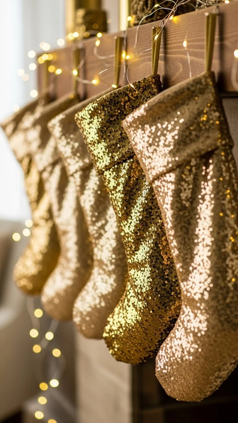 Swap traditional stockings for gold stockings to add a luxe touch. Pair with neutral or white accents to prevent excess shine. Affordable options include gold fabric or DIY sequined designs. They blend function and style, bringing sparkle to your fireplace area while holding gifts for family members.
