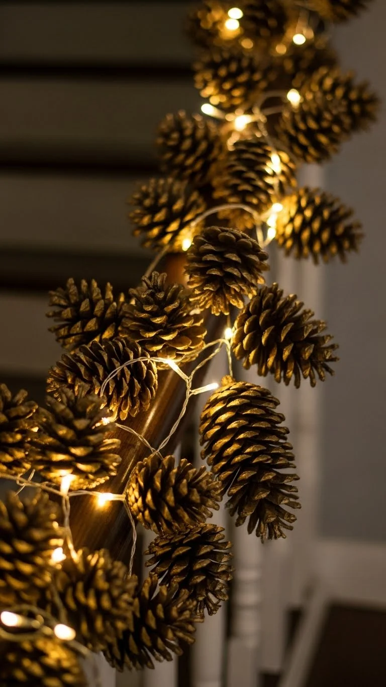 Spray-paint pinecones gold and string into garlands for a nature-inspired yet glamorous look. Add a few fairy lights for a twinkling effect. This DIY is simple and inexpensive, allowing you to bring both texture and metallic shine to your mantel, staircases, or windows.